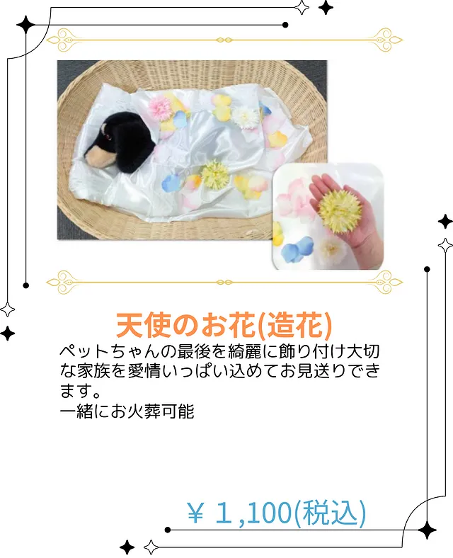 ペットちゃんとの一生で一度のお別れを綺麗に飾り付け、大切なご家族を愛情いっぱい込めてお見送りできます。